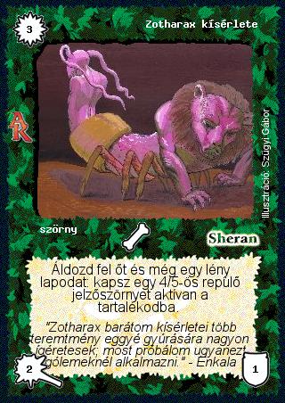 Kiadás: Alanori Krónika Gyakoriság: ritka Lapszín (isten): Sheran Típus: szörny Szöveg: Áldozd fel őt és még egy lény lapodat: kapsz egy 4/5-ös repülő jelzőszörnyet aktívan a tartalékodba. Szinesítő szöveg: "Zotharax barátom kísérletei több teremtmény eggyé gyúrására nagyon ígéretesek; most próbálom ugyanezt gólemeknél alkalmazni." - Enkala Illusztráció: