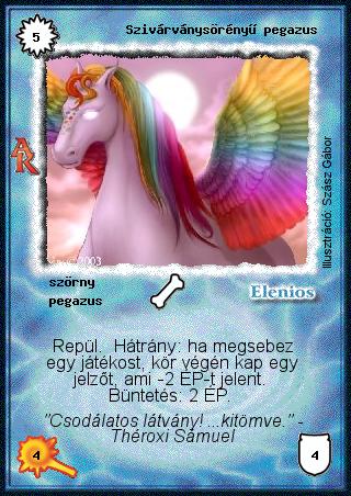 Kiadás: Alanori Krónika Gyakoriság: ritka Lapszín (isten): Elenios Típus: szörny Altípus: pegazus Szöveg: Repül. Hátrány: ha megsebez egy játékost, kör végén kap egy jelzőt, ami -2 ÉP-t jelent. Büntetés: 2 ÉP. Szinesítő szöveg: "Csodálatos látvány! ...kitömve." - Théroxi Sámuel Illusztráció: Szász Gábor