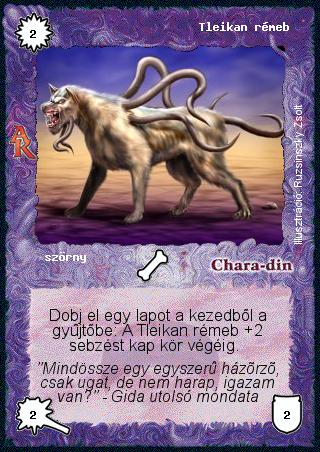 Kiadás: Alanori Krónika Gyakoriság: ritka Lapszín (isten): Chara-din Típus: szörny Szöveg: Dobj el egy lapot a kezedből a gyűjtőbe: A Tleikan rémeb +2 sebzést kap kör végéig. Szinesítő szöveg: "Mindössze egy egyszerű házőrző, csak ugat, de nem harap, igazam van?" - Gida utolsó mondata Illusztráció: Ruzsinszki Zsolt