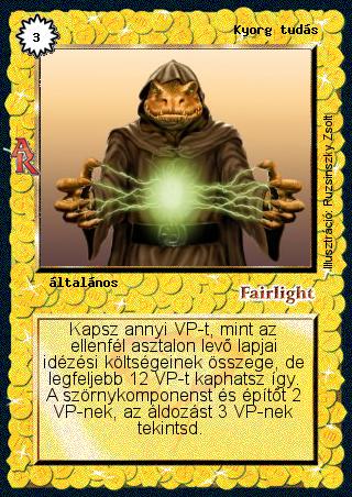 Kiadás: Alanori Krónika Gyakoriság: ritka Lapszín (isten): Fairlight Típus: általános Szöveg: Kapsz annyi VP-t, mint az ellenfél asztalon levő lapjai idézési költségeinek összege, de legfeljebb 12 VP-t kaphatsz így. A szörnykomponenst és építőt 2 VP-nek, az áldozást 3 VP-nek tekintsd. Illusztráció: Ruzsinszki Zsolt