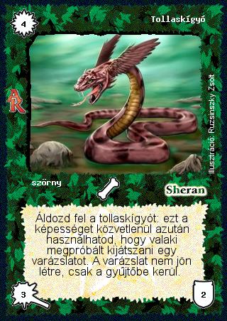 Kiadás: Alanori Krónika, Alappakli, 8. kiadás Gyakoriság: ritka Lapszín (isten): Sheran Típus: szörny Szöveg: Áldozd fel a tollaskígyót: ezt a képességet közvetlenül azután használhatod, hogy valaki megpróbált kijátszani egy varázslatot. A varázslat nem jön létre, csak a gyűjtőbe kerül. Illusztráció: Ruzsinszki Zsolt