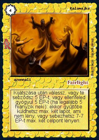 Kiadás: Alanori Krónika Gyakoriság: ritka Lapszín (isten): Fairlight Típus: azonnali Szöveg: Kijátszása után válassz, vagy te sebződsz 5 ÉP-t, vagy ellenfeled gyógyul 5 ÉP-t (ha legalább 5 hiányzik neki): ekkor gyűjtőbe küldhetsz max. két lapot, ami nem lény, vagy sebezhetsz 7-7 ÉP-t max. két célpont lényen. Illusztráció: Váradi János