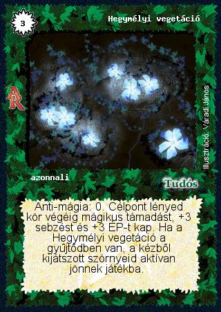 Szöveg: Anti-mágia: 0. Célpont lényed kör végéig mágikus támadást, +3 sebzést és +3 ÉP-t kap. Ha a Hegymélyi vegetáció a gyűjtődben van, a kézből kijátszott szörnyeid aktívan jönnek játékba.
