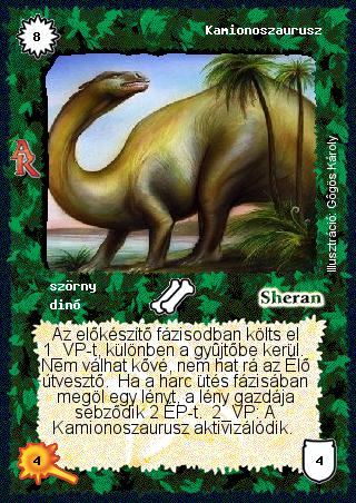 Kiadás: Alanori Krónika Gyakoriság: ritka Lapszín (isten): Sheran Típus: szörny Altípus: dinó Szöveg: Az előkészítő fázisodban költs el 1 VP-t, különben a gyűjtőbe kerül. Nem válhat kővé, nem hat rá az Élő útvesztő. Ha a harc ütés fázisában megöl egy lényt, a lény gazdája sebződik 2 ÉP-t. 2 VP: A Kamionoszaurusz aktivizálódik. Illusztráció: Gőgös Károly