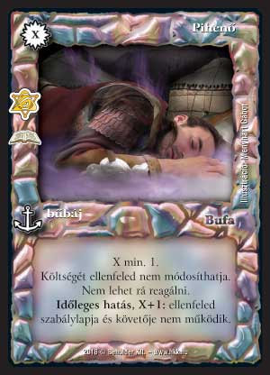 Kiadás: Elfeledett bűbájok (Zén) Gyakoriság: ritka Lapszín (isten): Bufa Típus: bűbáj Szöveg: X min. 1. Költségét ellenfeled nem módosíthatja. Nem lehet rá reagálni. Időleges hatás, X+1: ellenfeled szabálylapja és követője nem működik. Időleges hatás, X+1: ellenfeled szabálylapja és követője nem működik. Illusztráció: Menyhárt Gábor