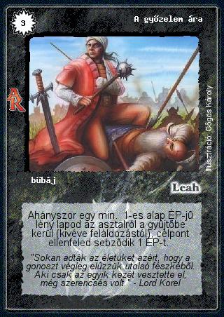 Kiadás: Alanori Krónika Gyakoriság: ritka Lapszín (isten): Leah Típus: bűbáj Szöveg: Ahányszor egy min. 1-es alap ÉP-jű lény lapod az asztalról a gyűjtőbe kerül (kivéve feláldozástól), célpont ellenfeled sebződik 1 ÉP-t. Szinesítő szöveg: "Sokan adták az életüket azért, hogy a gonoszt végleg elűzzük utolsó fészkéből. Aki csak az egyik kezét vesztette el, még szerencsés volt." - Lord Korel Illusztráció: Gőgös Károly