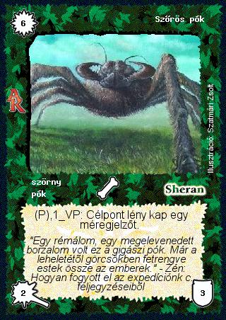 Kiadás: Alanori Krónika Gyakoriság: ritka Lapszín (isten): Sheran Típus: szörny Altípus: pók Szöveg: (P),1 VP: Célpont lény kap egy méregjelzőt. Szinesítő szöveg: "Egy rémálom, egy megelevenedett borzalom volt ez a gigászi pók. Már a leheletétől görcsökben fetrengve estek össze az emberek." - Zén: Hogyan fogyott el az expedíciónk c. feljegyzéseiből Illusztráció: Szatmári Zsolt