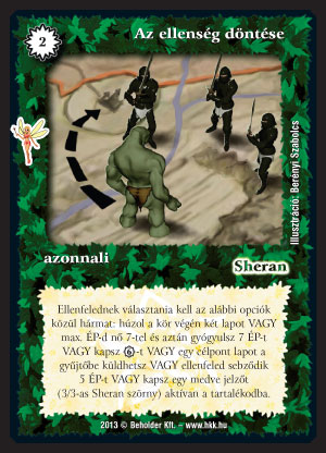 Az ellenség döntése (7): Fantáziadús, érdekes lap, amit az ellenfél megpróbálhat 'elrontani', pl. Bilincs mellett húzzál, Szűk esztendők mellett VP-termelés, vagy lap nélkül lapleszedés, de a második-harmadik képesség kiválasztásánál már biztosan gondban lesz. Azért inkább a móka-faktora erős (medve-jelző rulez!), versenypakliban picit bizonytalan.