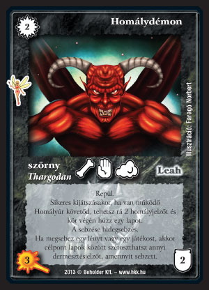 Homálydémon (8): A Homályúr eddig is jól használható követő volt, azzal kombinálva ez a Thargodan megmutatja az izmait. (Thargodan pakliban nem próbáltuk, mivel eléggé a végén döbbentünk rá, hogy az is lehetne.) Ködös lapként előkeresve akár, a kör végi húzással és a két igen hasznos homályjelzővel az ereje nem kétséges. Követő nélkül eléggé megcsappan a tudása, de azért egy ködös pakliba beférhet, asztalon maradó lapok kikapcsolgatására, ha be tud ütni.