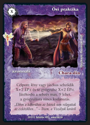Ősi praktika (9): Abszolút univerzális papír. Beférhet akár az agyon-optimalizált Trinigan kontrollba is 1-2, ha már Tridarkun miatt úgyis játszunk lilával. Beraknám bilincsbe ill. bármilyen, Chara-dint és varázslatokat is használó pakliba. Nagy ereje, hogy egy kontrolltól, ha kevés a lapja, teli őrposzttal ritkán vár az ellenfél 8-9 sebzést, amit egy kis VP-termelés után lazán kiosztunk kivégzésképpen. Sokszínűségben, lilával játszó Csatamezőben is viszont fogjuk látni szerintem.
